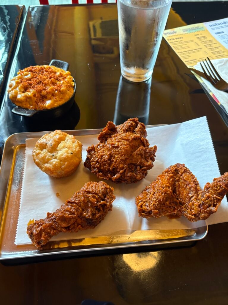 I don’t love to share this fact necessarily but full transparency with my audience: I’m a bit of a cheat when it comes to experiencing a new restaurant; I nearly always read through the menu if I can. That is to say that the path I would take for this meal was preordained by an earlier version of myself: three pieces of dark meat (which comes with a biscuit muffin), a side of mac and cheese, two cans of Coke (more on that in a second), and a slice of their buttermilk ayib pie.
