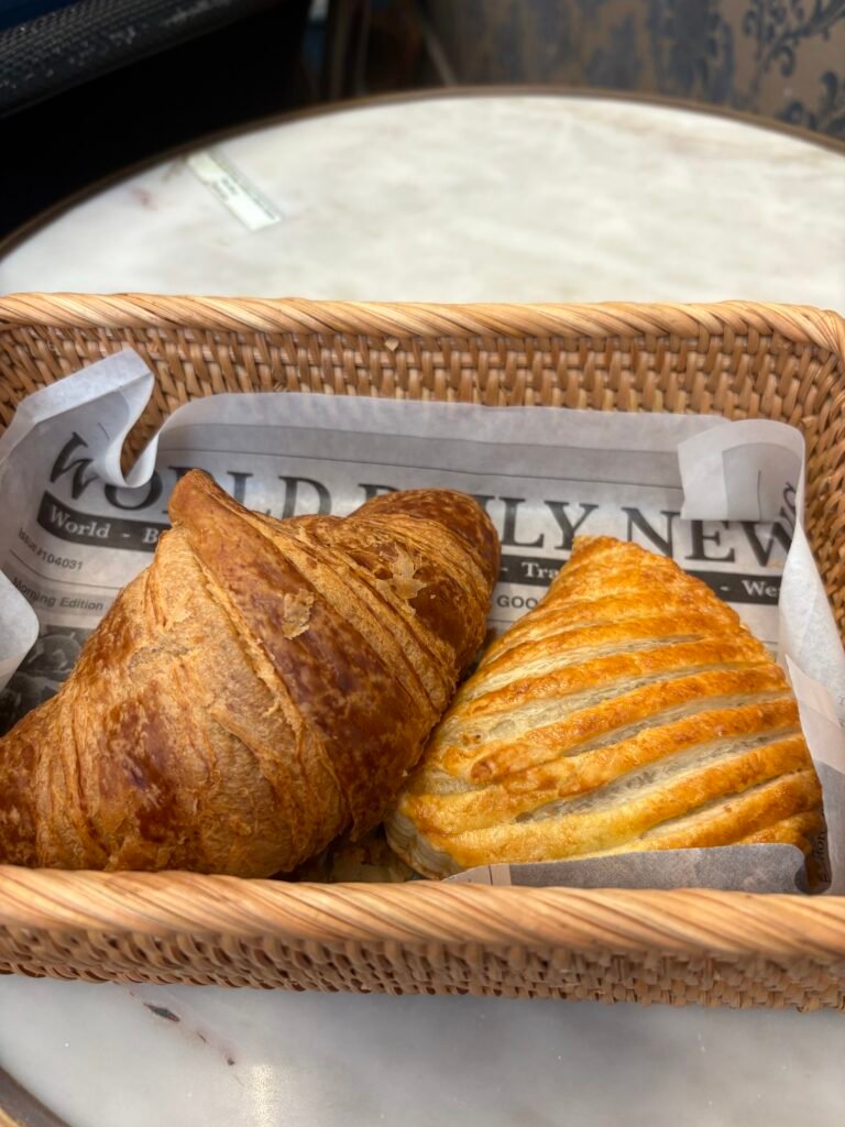 On the other side of the store was the only reason anybody was here in the first place: a beautiful display of pastries that offers a choose-your-own-adventure style of infinite possibilities. The choice was not easy, because everything looked and smelled incredible. I opted for a butter croissant and an apple tart. But deep in my heart I know I will be back to try the éclair. And the pain au chocolat. And the meringue. And the almond croissant. And honestly, I’m not upset that the bench is so deep.